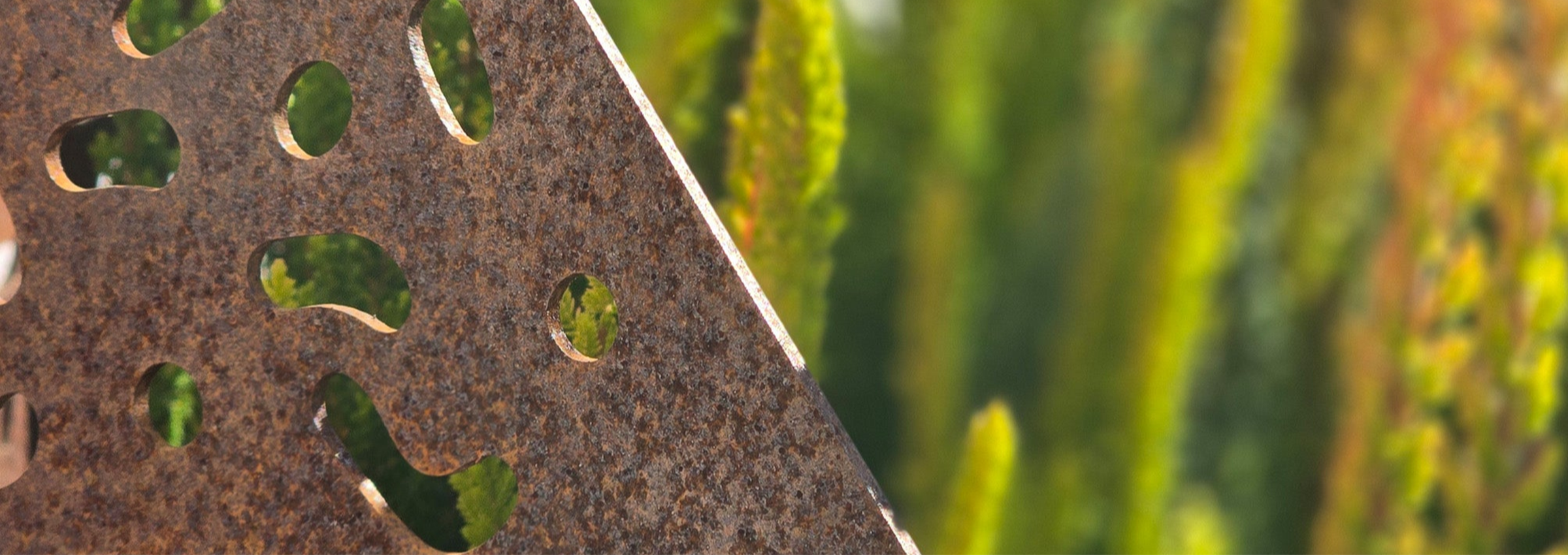 Cortenstålets levande yta ger varje kruka i corten och varje pallkrage i corten en naturlig och fördjupad patina. Objekten fungerar lika väl som solitära installationer som i serier där de bygger rytm, linjer och arkitektoniska samband i landskapet.
